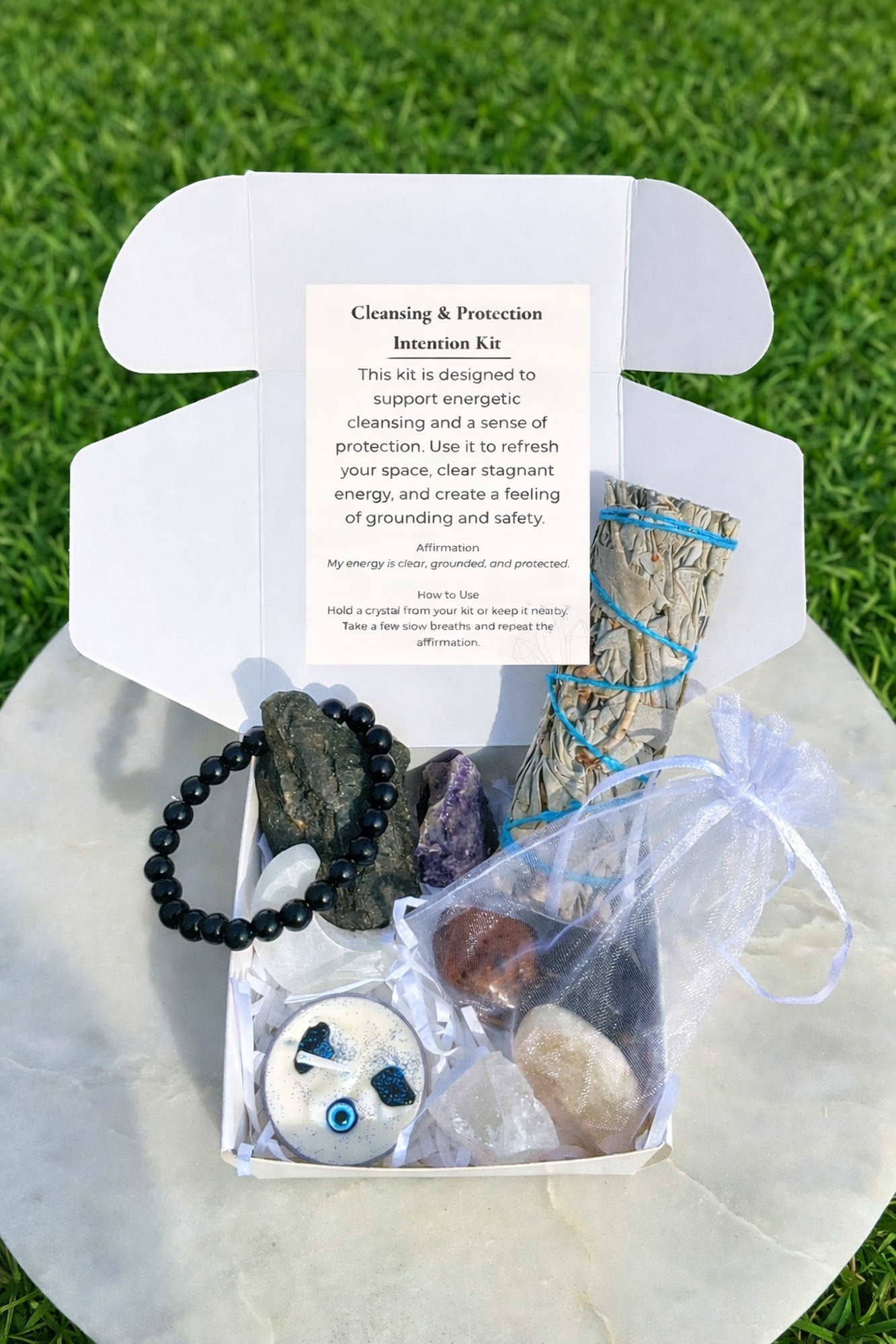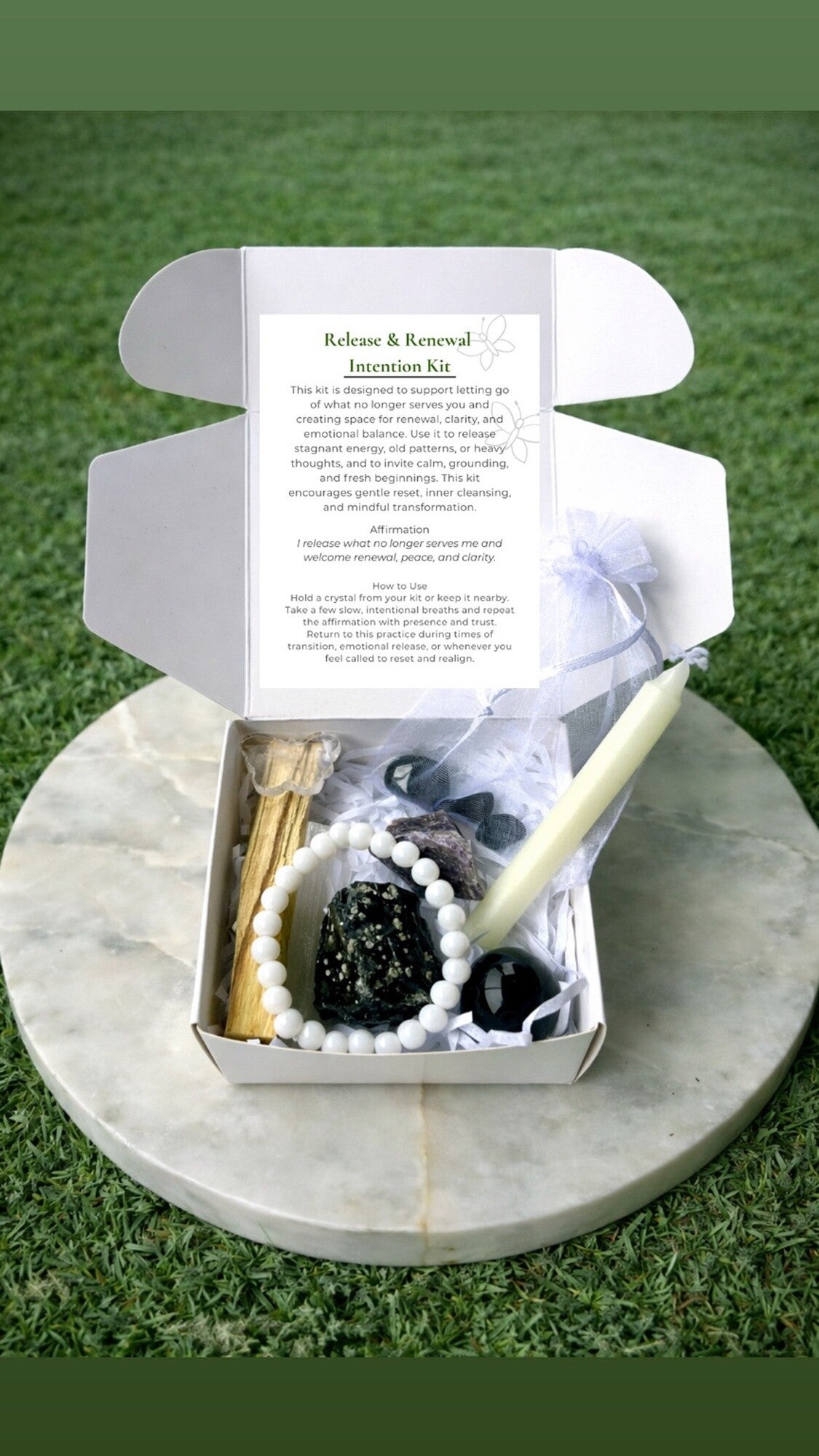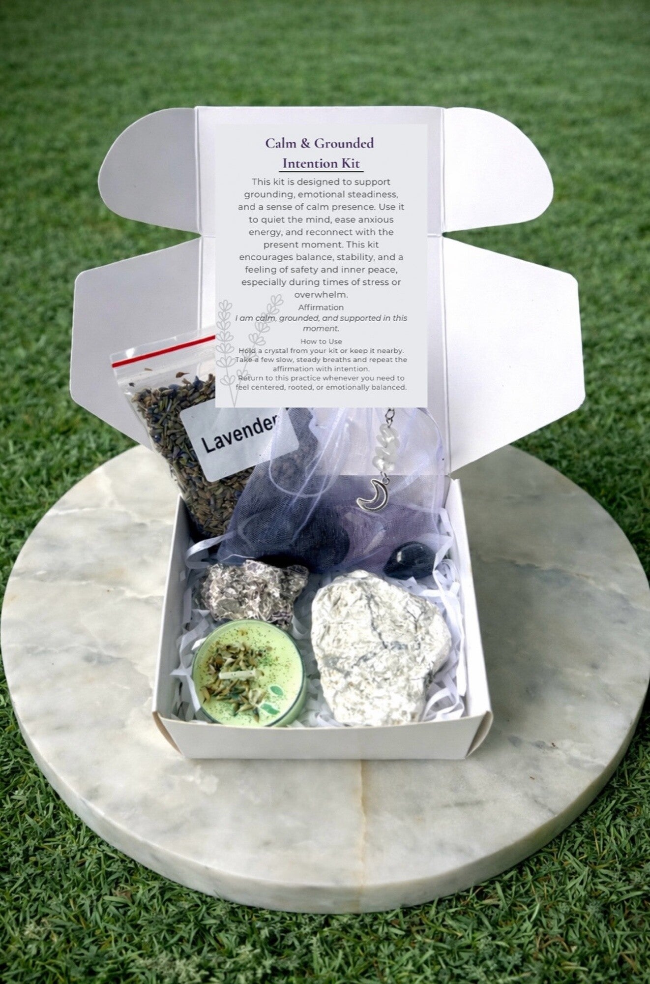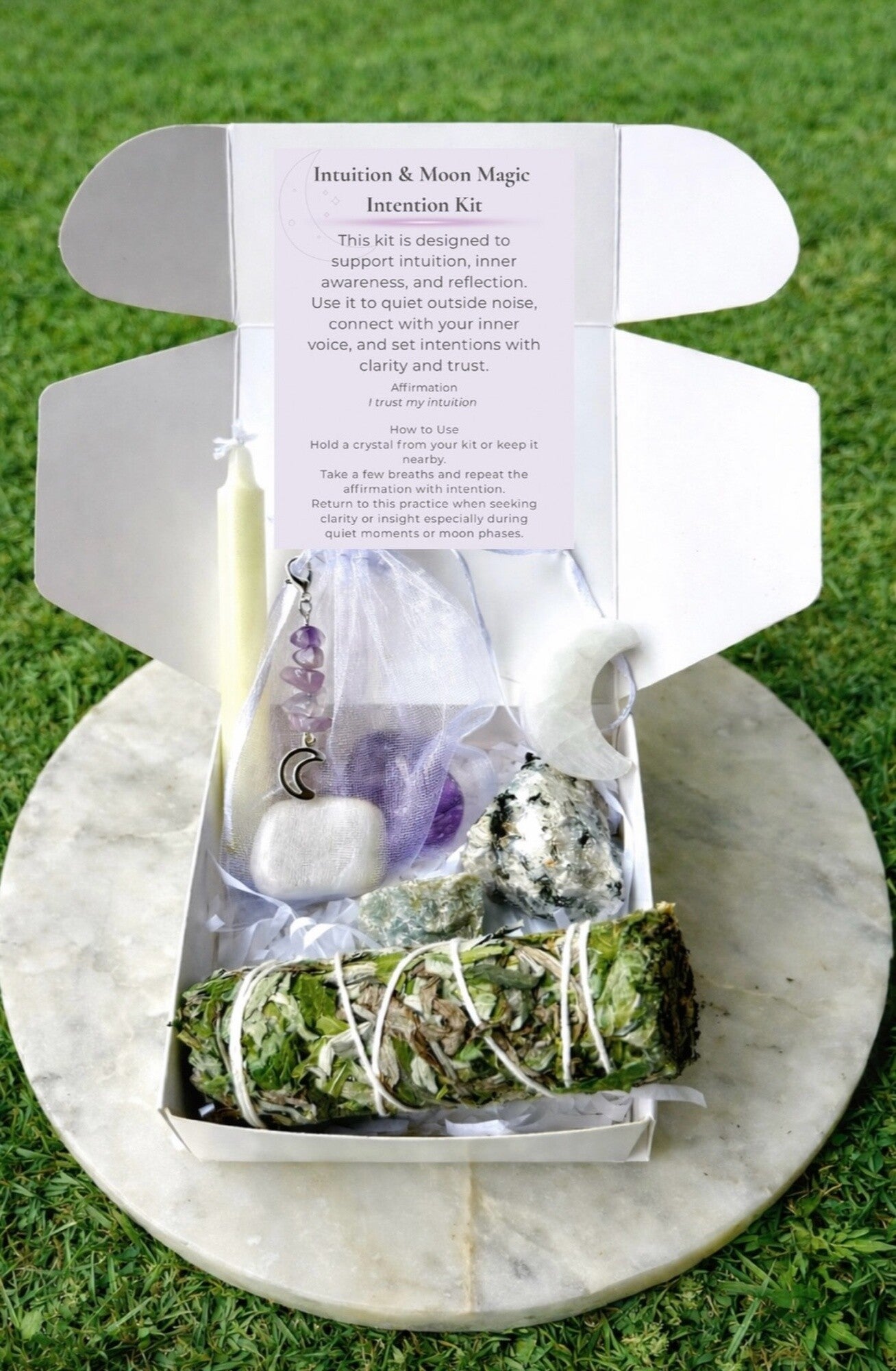 Tools for intentional living, reflection, and energetic balance. All intention kits consists of a variety of crystals both rough and tumbled based on availability, a selenite stick, a cleansing tool or herbs, an intention card , one candle, and one gift. Click "see details" to learn more about each kit type.